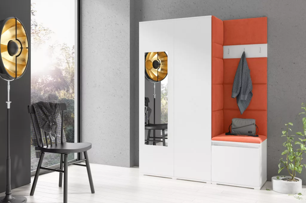 Blum 11 kárpitozott előszobafal tükörrel, fehér - narancssárga 17 - egyedi