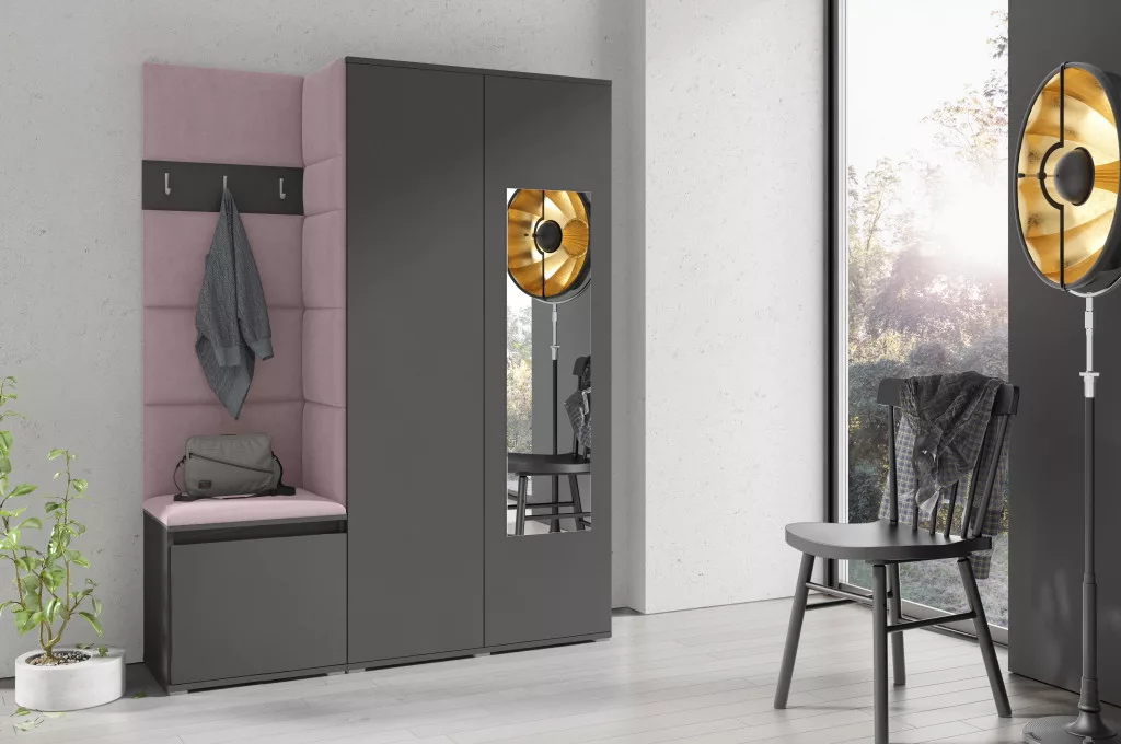 Blum 11 kárpitozott előszobafal tükörrel, grafit - rózsaszín 19 - egyedi