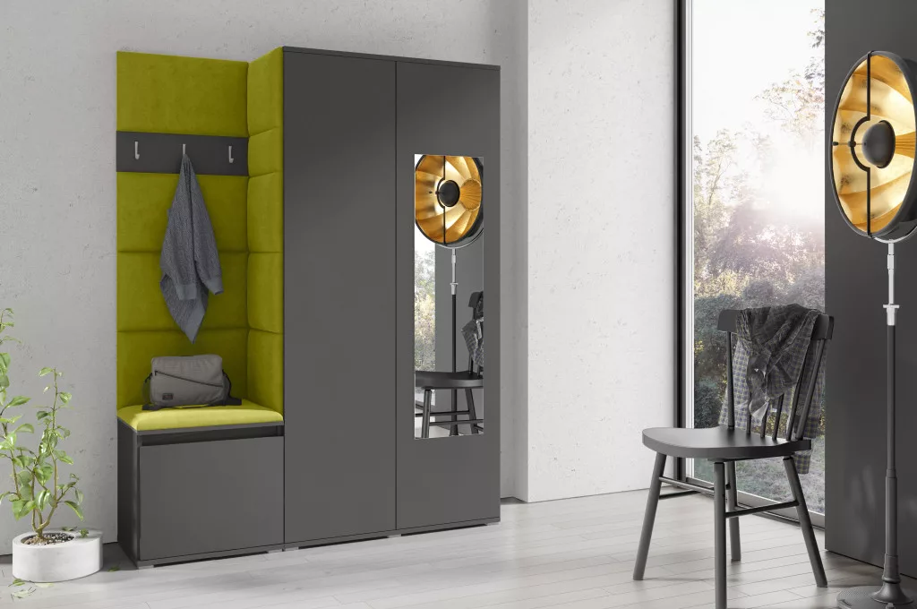 Blum 11 kárpitozott előszobafal tükörrel, grafit - zöld 12 - egyedi