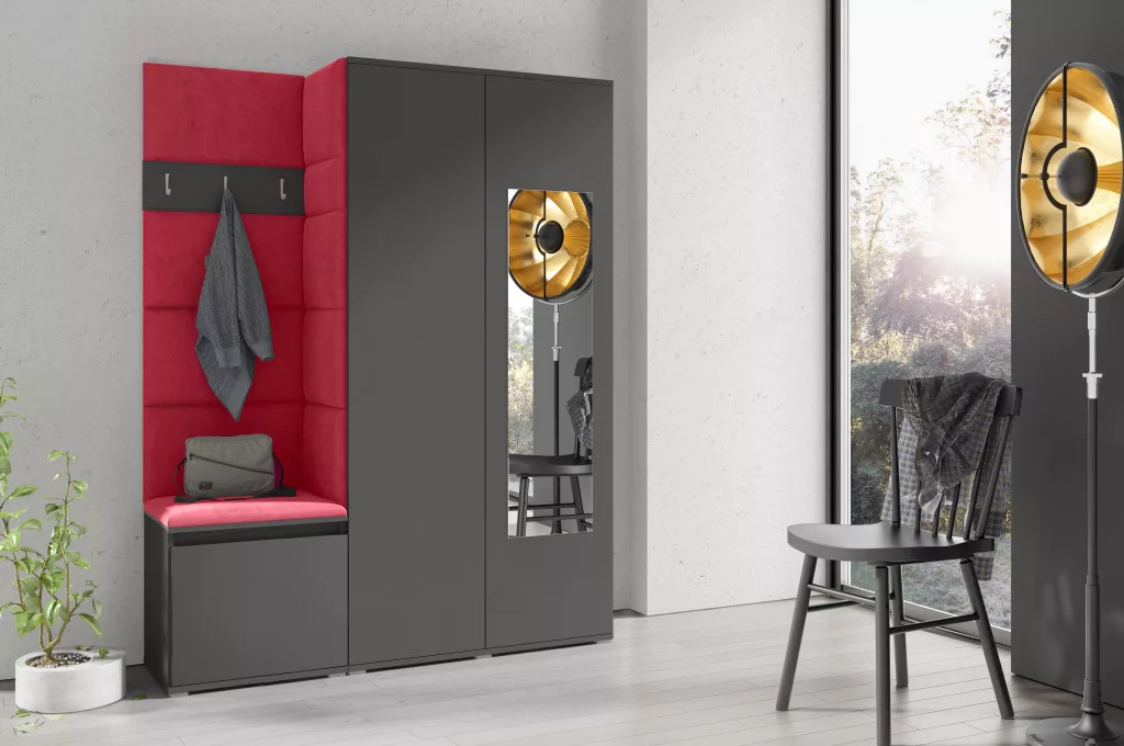 A modern és letisztult Emi 11 előszobafal a legjobb választás előszobádba. A kifinomult design mellett a kárpitozott ülőpárnák és háttámlák biztosítanak kényelmet használat közben. A kárpitozott panelek kiváló minőségű Trinity velúr szövetből készülnek, melynek puha és kellemes tapintású a felülete, valamint kiemelten nagy a kopásállósága. A szövet hidrofób bevonattal készül, amely megvédi a kiömlött folyadékoktól és sokkal könnyebbé teszi a tisztítást. Válaszd ki a számodra legmegfelelőbb színösszeállítást.