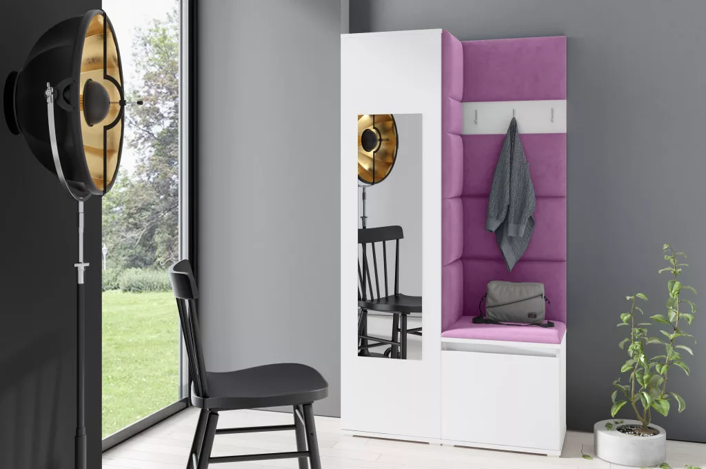 Blum 13 kárpitozott előszobafal tükörrel, fehér - lila 11 - egyedi