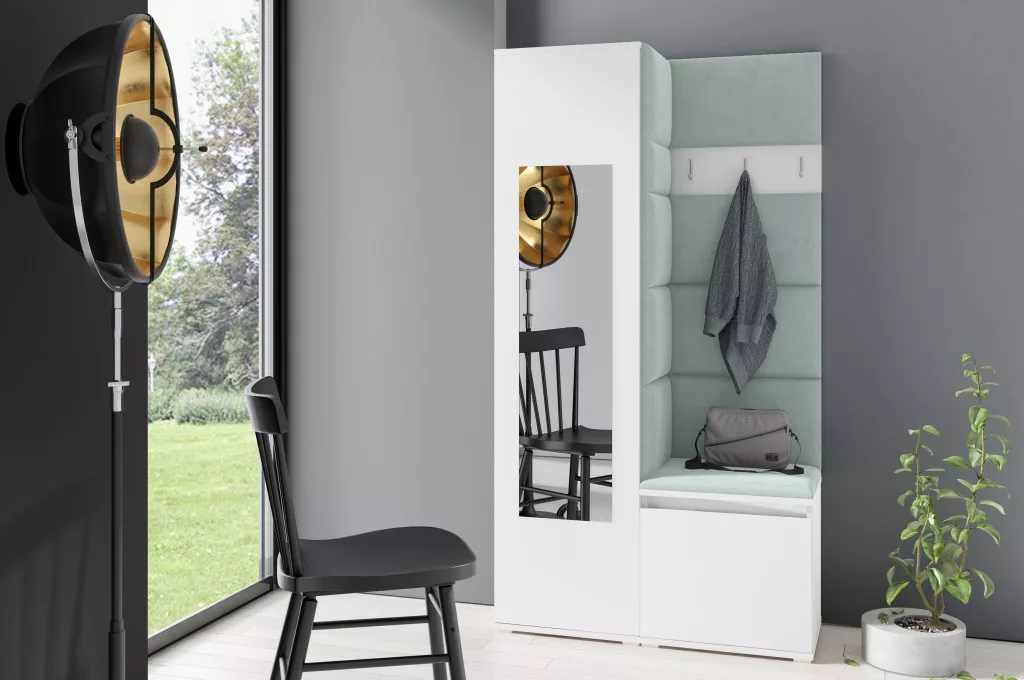 Blum 13 kárpitozott előszobafal tükörrel, fehér - menta 21 - egyedi