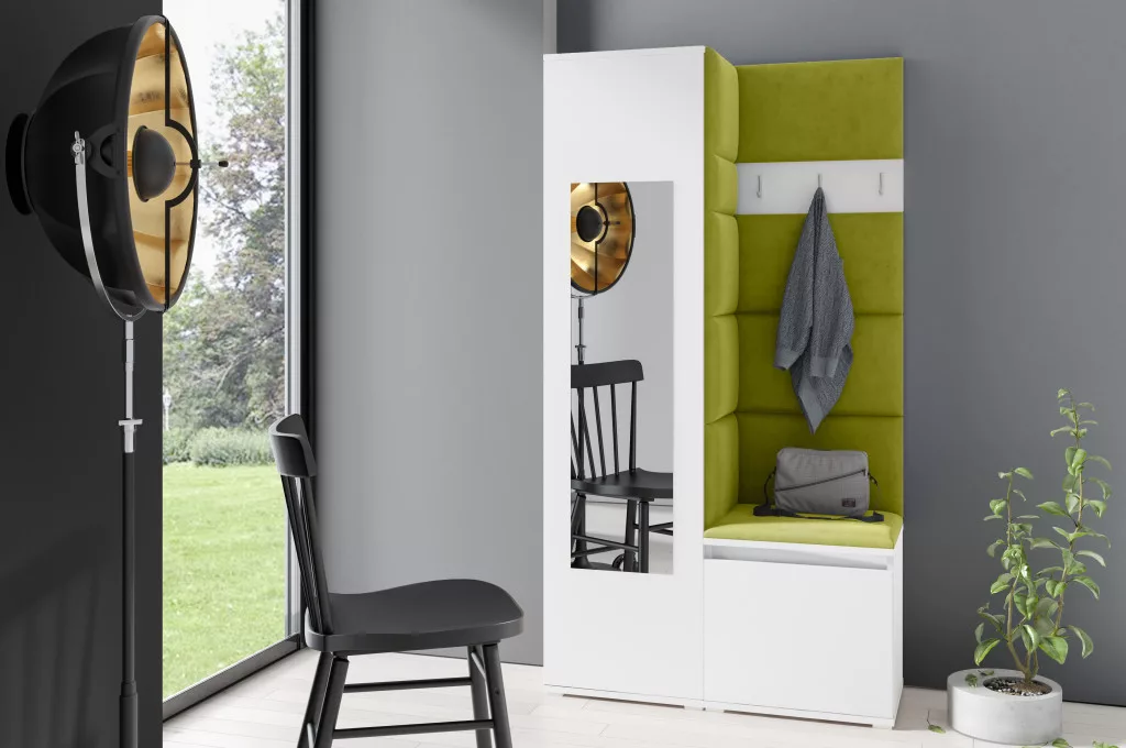 Blum 13 kárpitozott előszobafal tükörrel, fehér - zöld 12 - egyedi