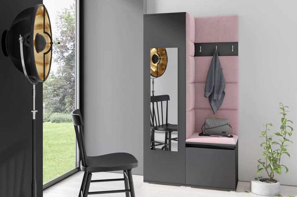 Blum 13 kárpitozott előszobafal tükörrel, grafit - rózsaszín 19 - egyedi