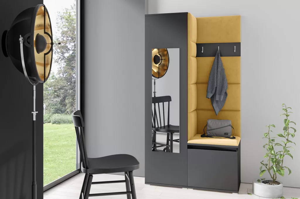 Blum 13 kárpitozott előszobafal tükörrel, grafit - sárga 18 - egyedi