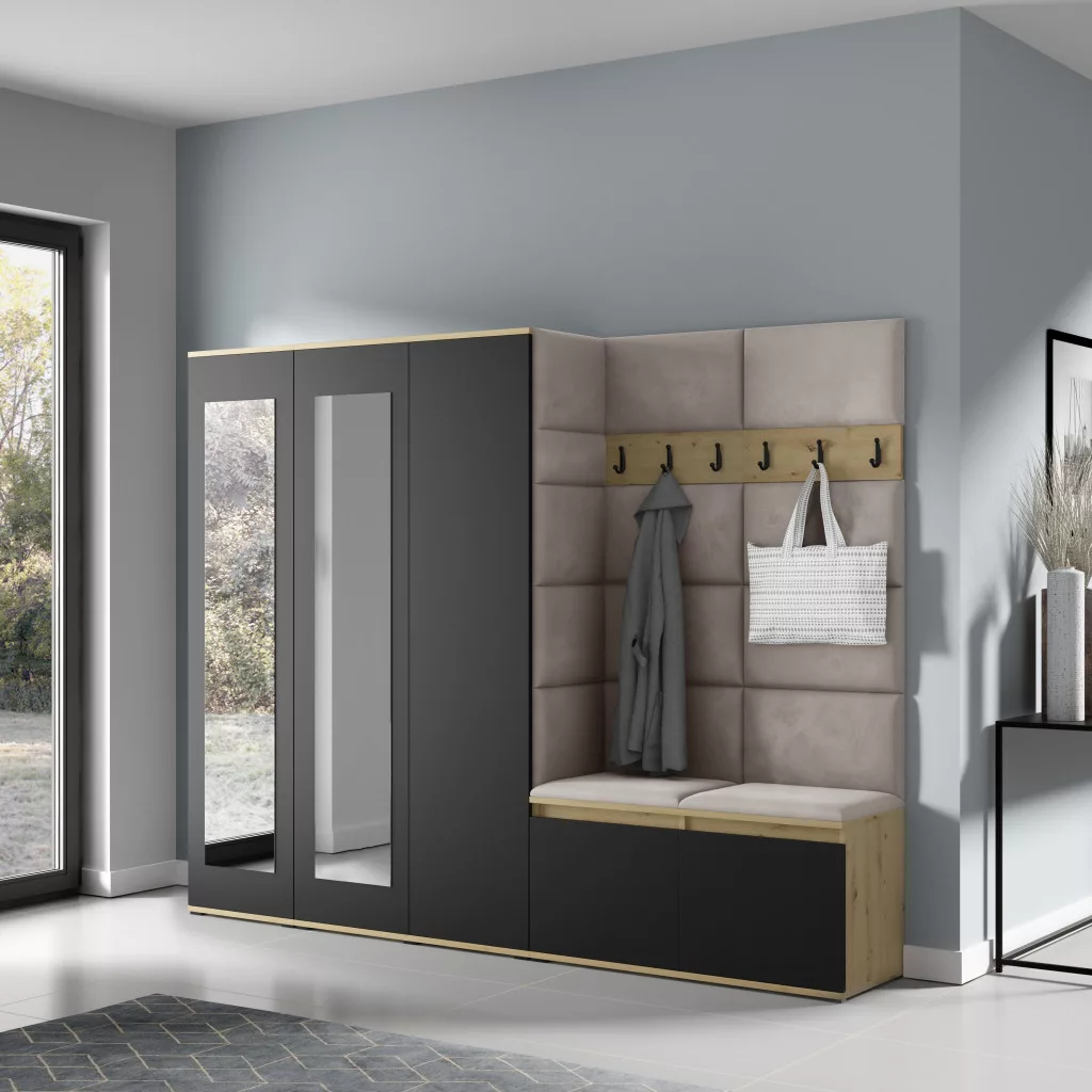 Blum 15 kárpitozott előszobafal tükörrel, artisan/fekete - bézs 03