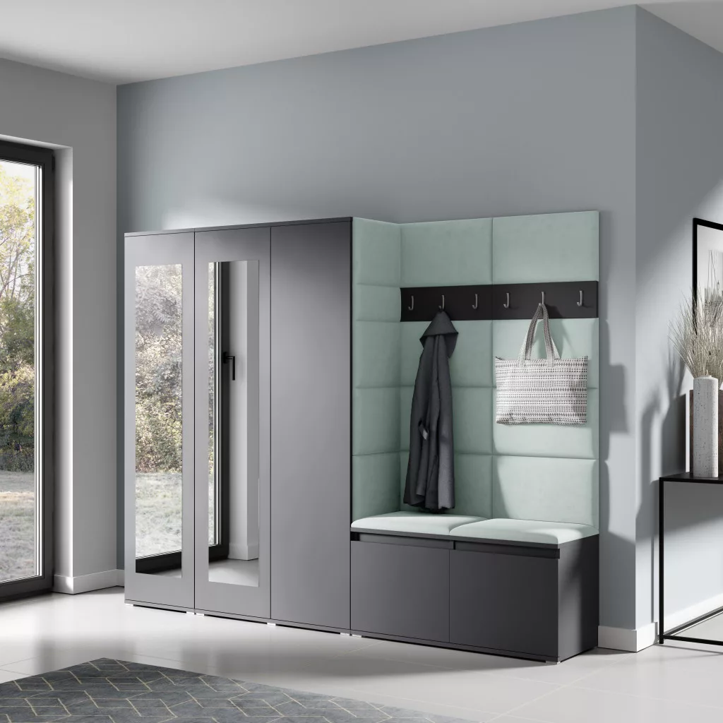 Blum 15 kárpitozott előszobafal tükörrel, grafit - menta 21 - egyedi