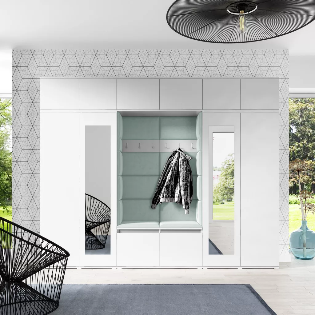 Blum 17 kárpitozott előszobafal tükörrel, fehér - menta 21 - egyedi
