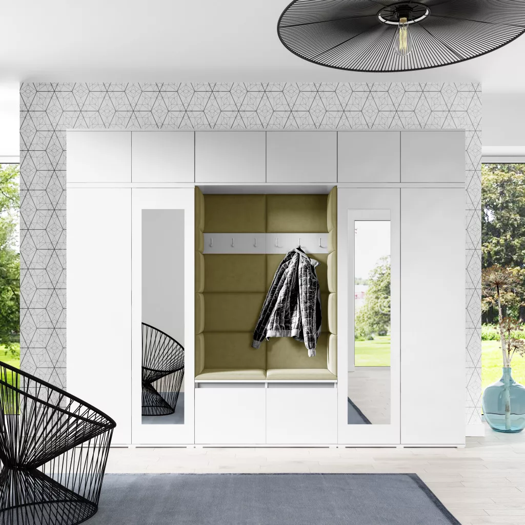 Blum 17 kárpitozott előszobafal tükörrel, fehér - oliva zöld 27 - egyedi