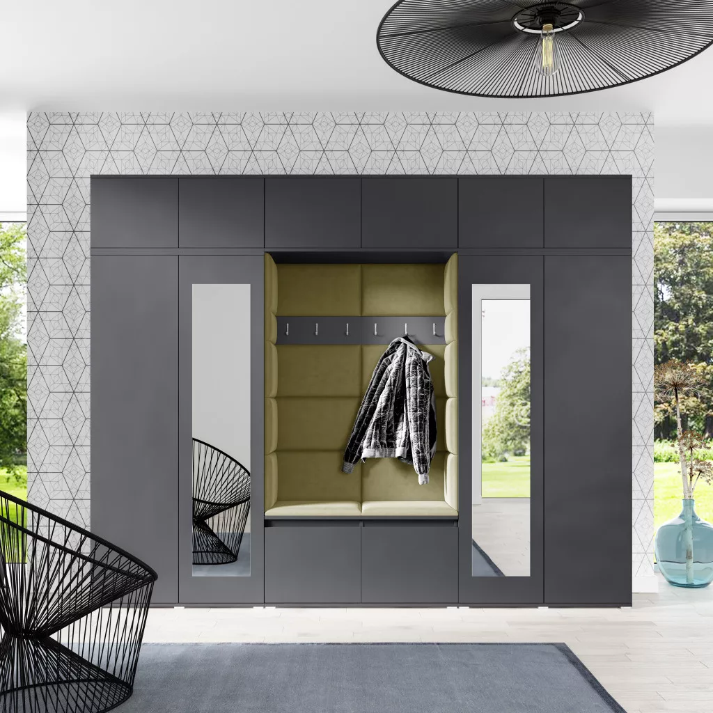 Blum 17 kárpitozott előszobafal tükörrel, grafit - oliva zöld 27 - egyedi