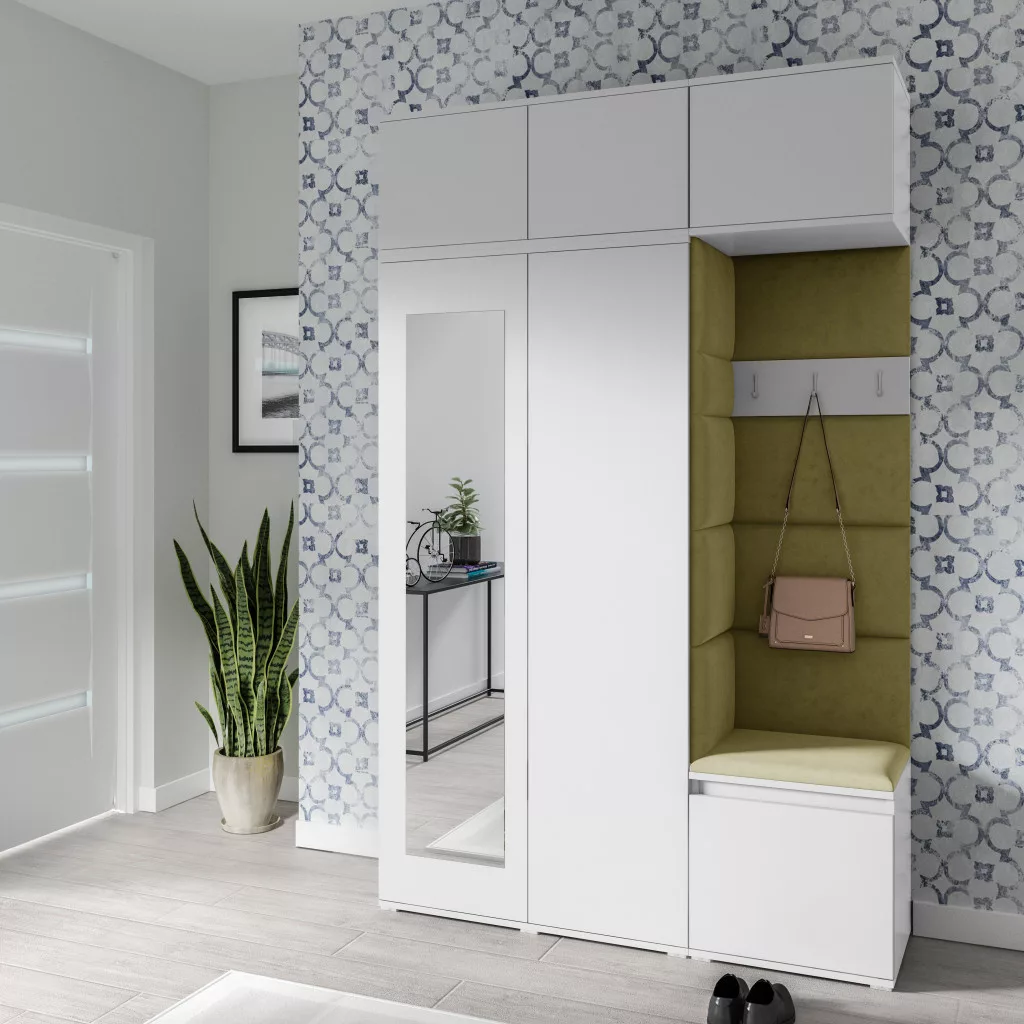 Blum 18 kárpitozott előszobafal tükörrel, fehér - oliva zöld 27 - egyedi