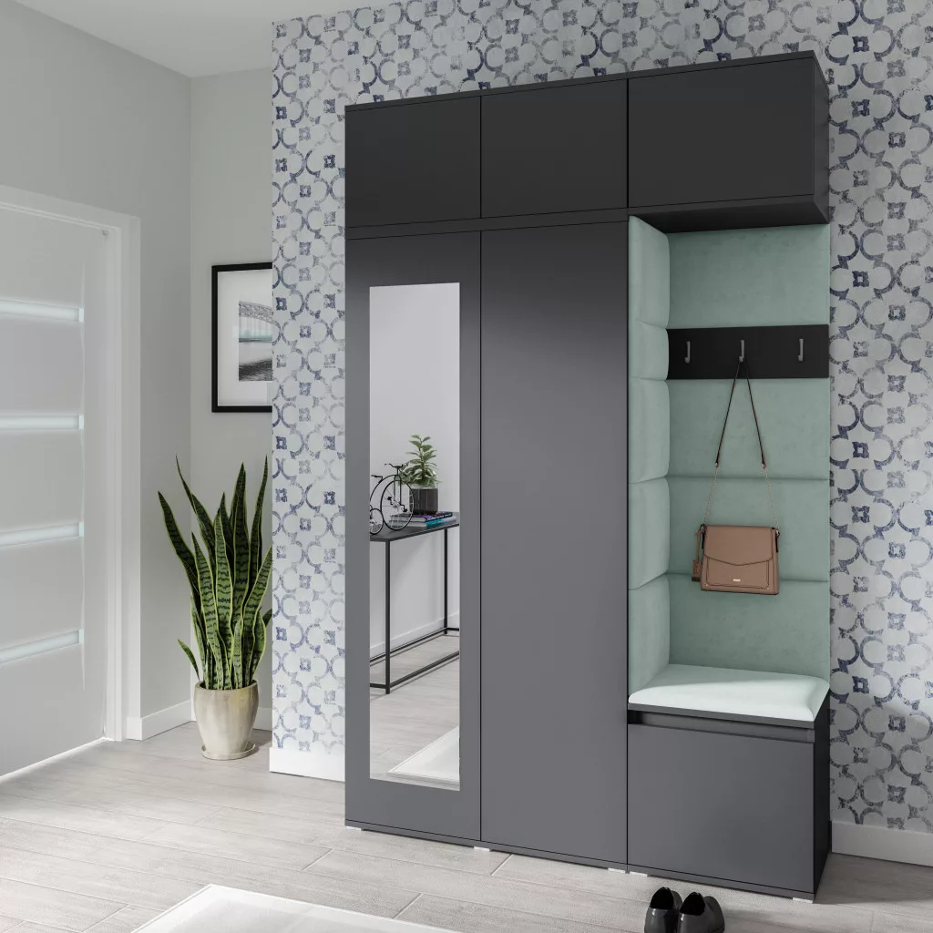 Blum 18 kárpitozott előszobafal tükörrel, grafit - menta 21 - egyedi