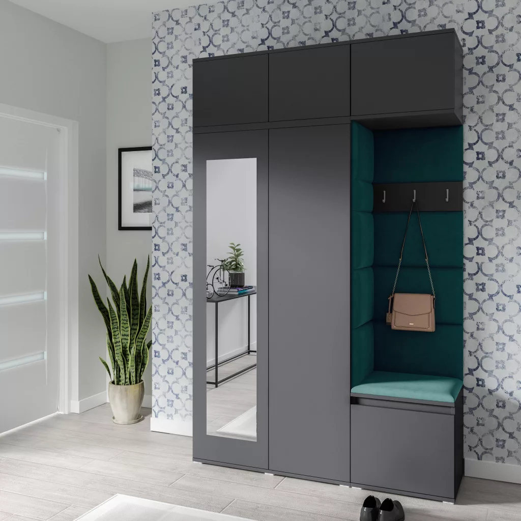 Blum 18 kárpitozott előszobafal tükörrel, grafit - sötétzöld 28 - egyedi