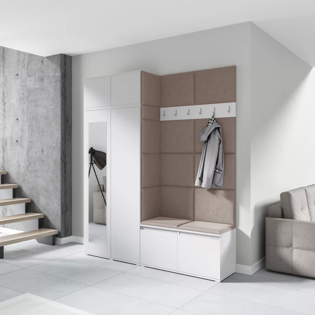 A kárpitozott paneleket közvetlenül a falra, a szekrényre és a cipőtartóra kell rögzíteni ragasztó segítségével. A ragasztót a csomag nem tartalmazza.