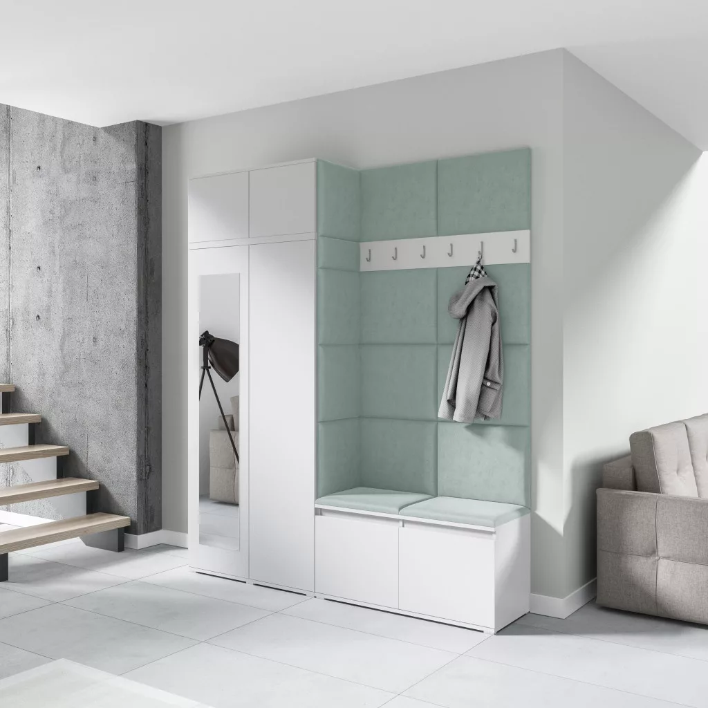Blum 19 kárpitozott előszobafal tükörrel, fehér - menta 21 - egyedi