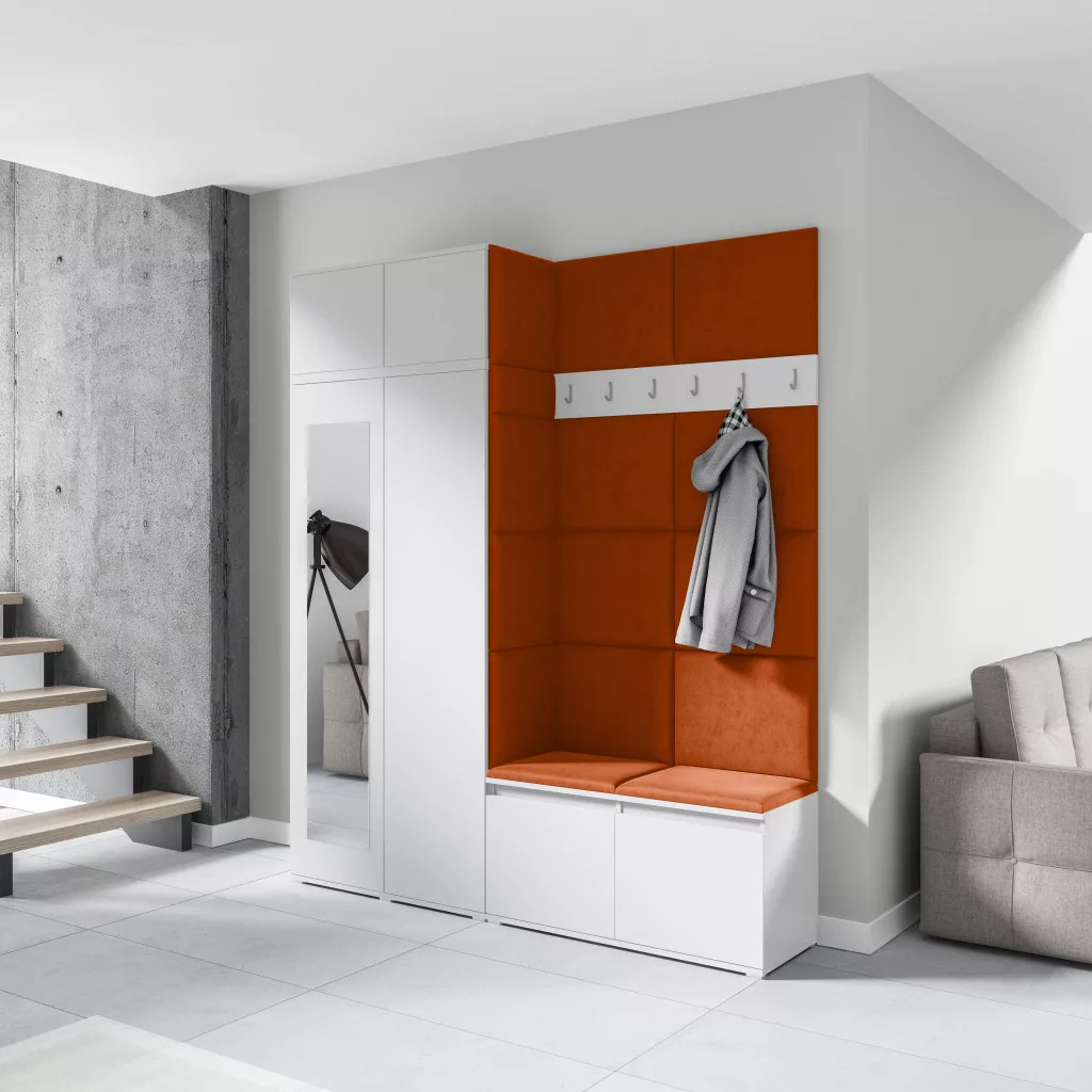 Blum 19 kárpitozott előszobafal tükörrel, fehér - narancssárga 25 - egyedi