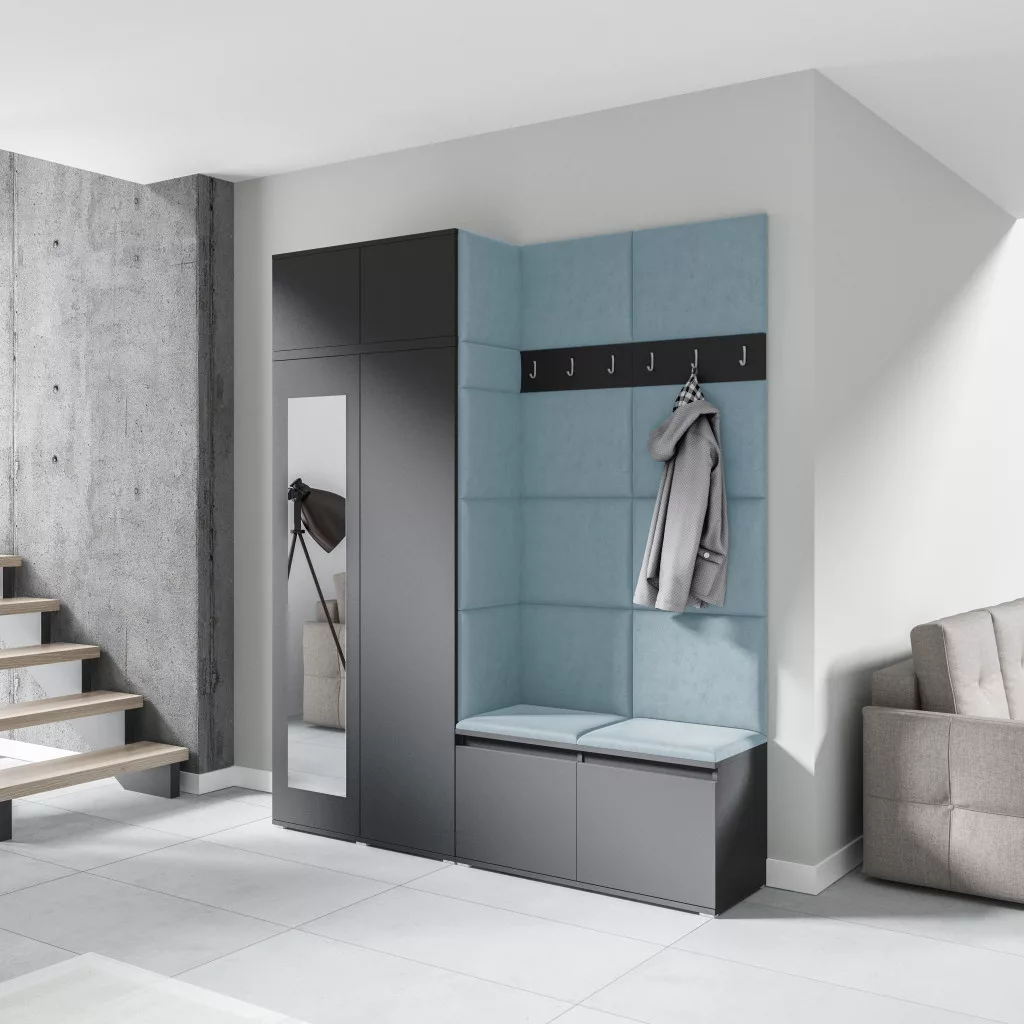 Blum 19 kárpitozott előszobafal tükörrel, grafit - aqua 22 - egyedi