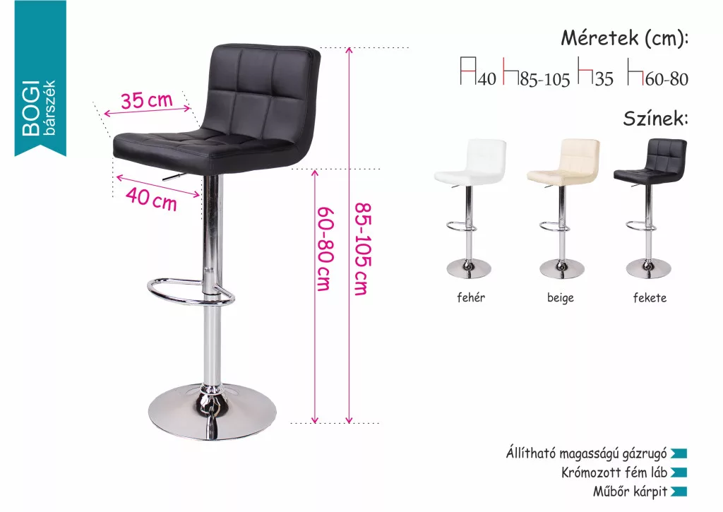 A Bogi bárszék krómozott fém lábbal, műbőr kárpittal készül. Állítható magasságú gázrugója segítségével bárasztalunkhoz, pultunkhoz igazíthatjuk az ülőlap magasságát, hogy a lehető legkényelmesebb legyen számunkra. Bogi bárszék: trendi megjelenés és tökéletes kényelem a modern otthonokba!
