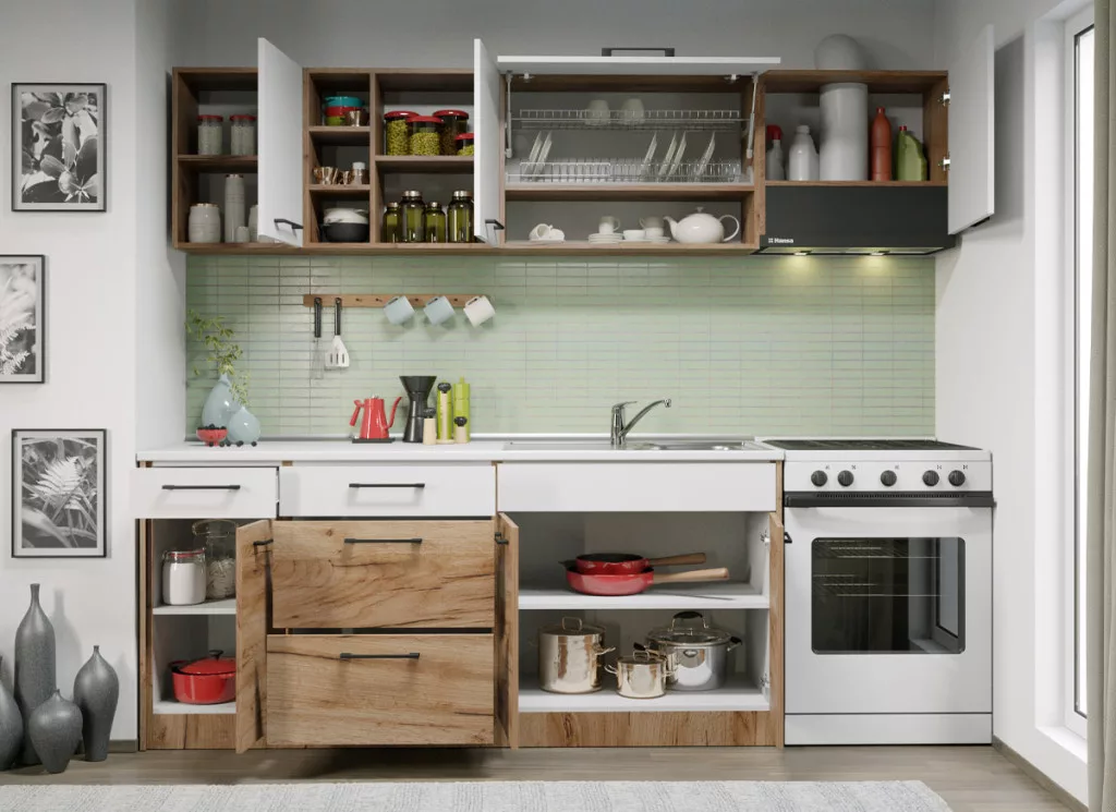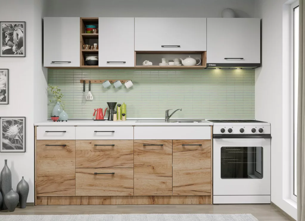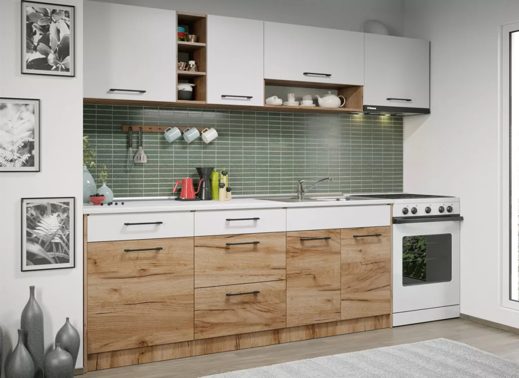A Bonita konyhabútor – Összeállítás  02 – 242 cm különböző méretű konyhákhoz is alkalmas, a beállítási lehetőségek rugalmassága miatt. Az elegáns és rusztikus megjelenés mellett a bútorok hasznossága vitathatatlan! Hatékony rendszerezést biztosít az élelmiszerek és a főzéshez szükséges eszközök számára.