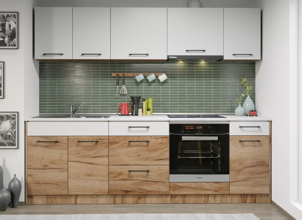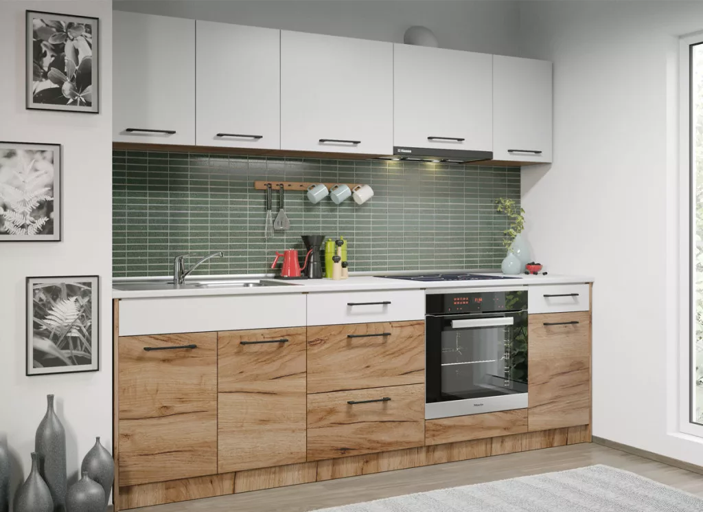 A Bonita konyha 04-es összeállítás  – 243,2 cm tökéletes választás különböző méretű konyhákhoz, köszönhetően a moduláris felépítés rugalmasságának. Az elegáns és rusztikus megjelenés mellett a bútorok funkcionalitása vitathatatlan! Hatékonyan szervezi meg az ételek és főzéshez szükséges eszközök tárolását.