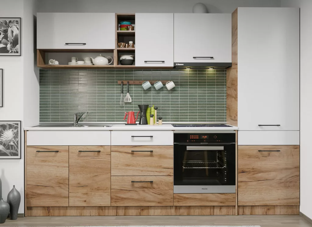 A Bonita konyha 05-ös Összeállítás  – 264 cm ideális választás különböző méretű konyhákhoz, köszönhetően a moduláris felépítés rugalmasságának. Az elegáns és rusztikus megjelenés mellett a bútorok funkcionalitása vitathatatlan! Hatékonyan szervezi meg az ételek és főzéshez szükséges eszközök tárolását.