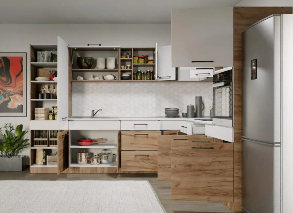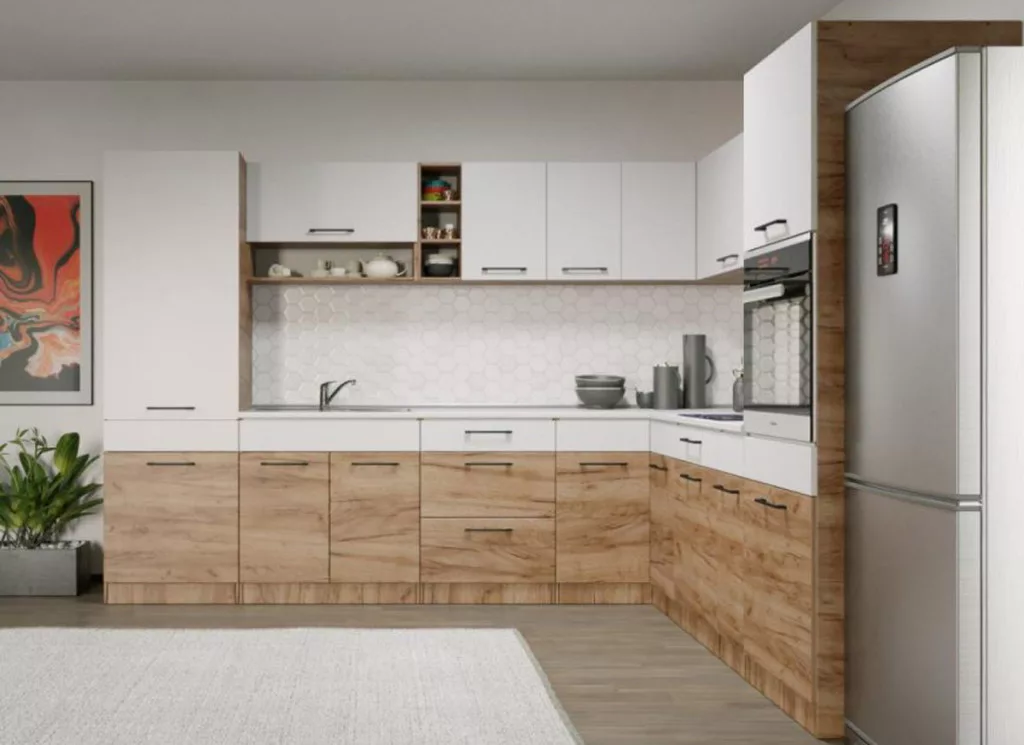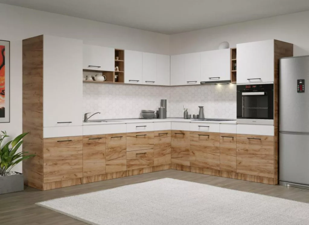 A Bonita konyha – Összeállítás  13 – 304/254 cm rugalmas kialakításának köszönhetően különböző méretű konyhákba is ideális. A letisztult és rusztikus megjelenés mellett a bútorok funkcionalitása is kiemelkedő, amely biztosítja az ételek és konyhai eszközök hatékony rendszerezését.
