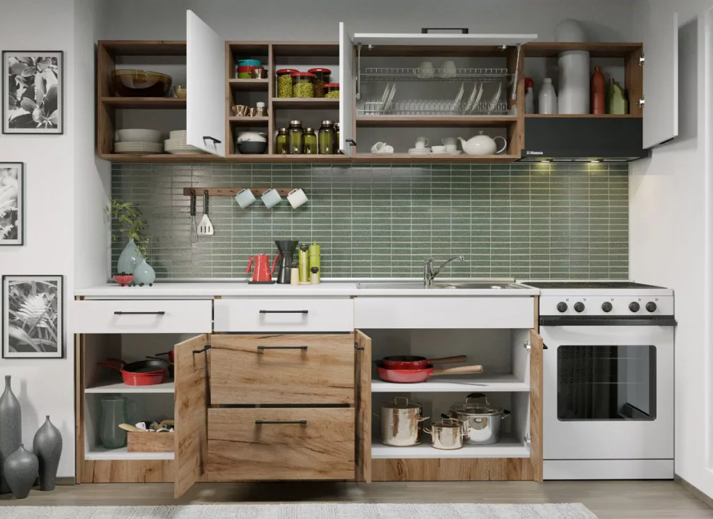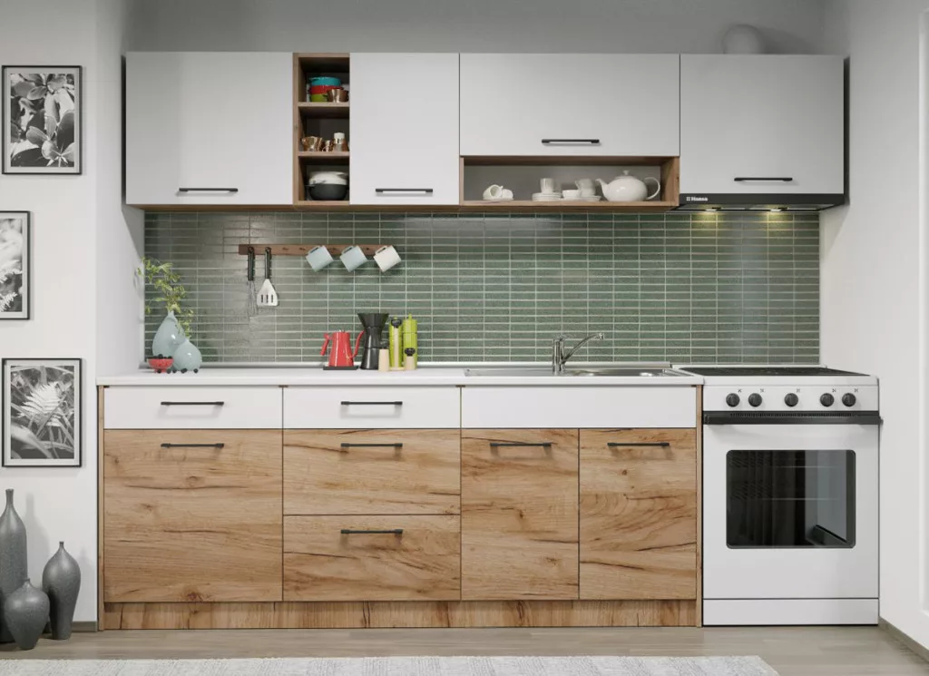 A Bonita konyhabútor – 19-es összeállítás – 260 cm ideális különböző méretű konyhákhoz, köszönhetően a konfiguráció rugalmasságának. Az elegáns és rusztikus megjelenés mellett a bútorok funkcionalitása vitathatatlan! Hatékonyan segíti az élelmiszerek és a főzéshez szükséges eszközök rendszerezését.