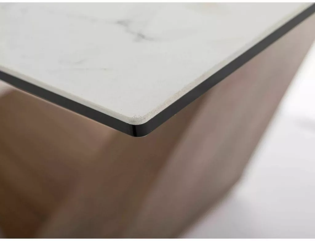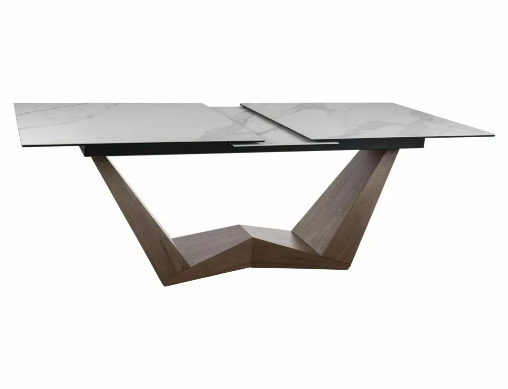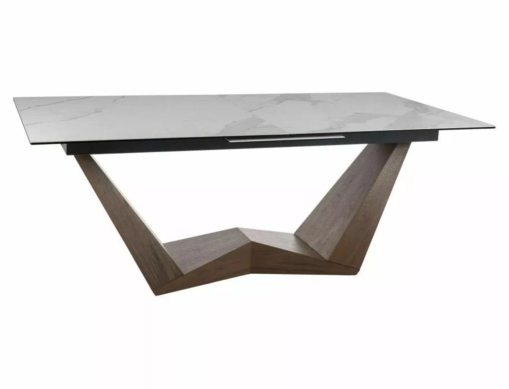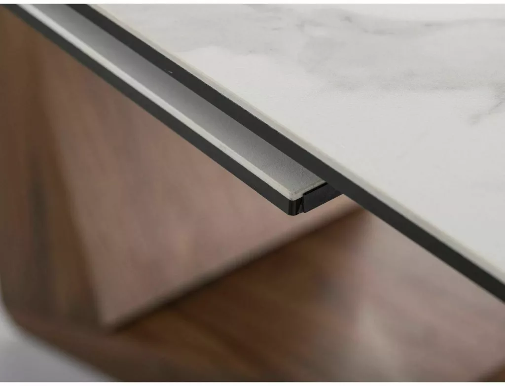 Meghosszabbítható asztal, teteje: edzett üveg + kerámia STATUARIO VENATO, váz: fém, szín: matt fehér / diófa.