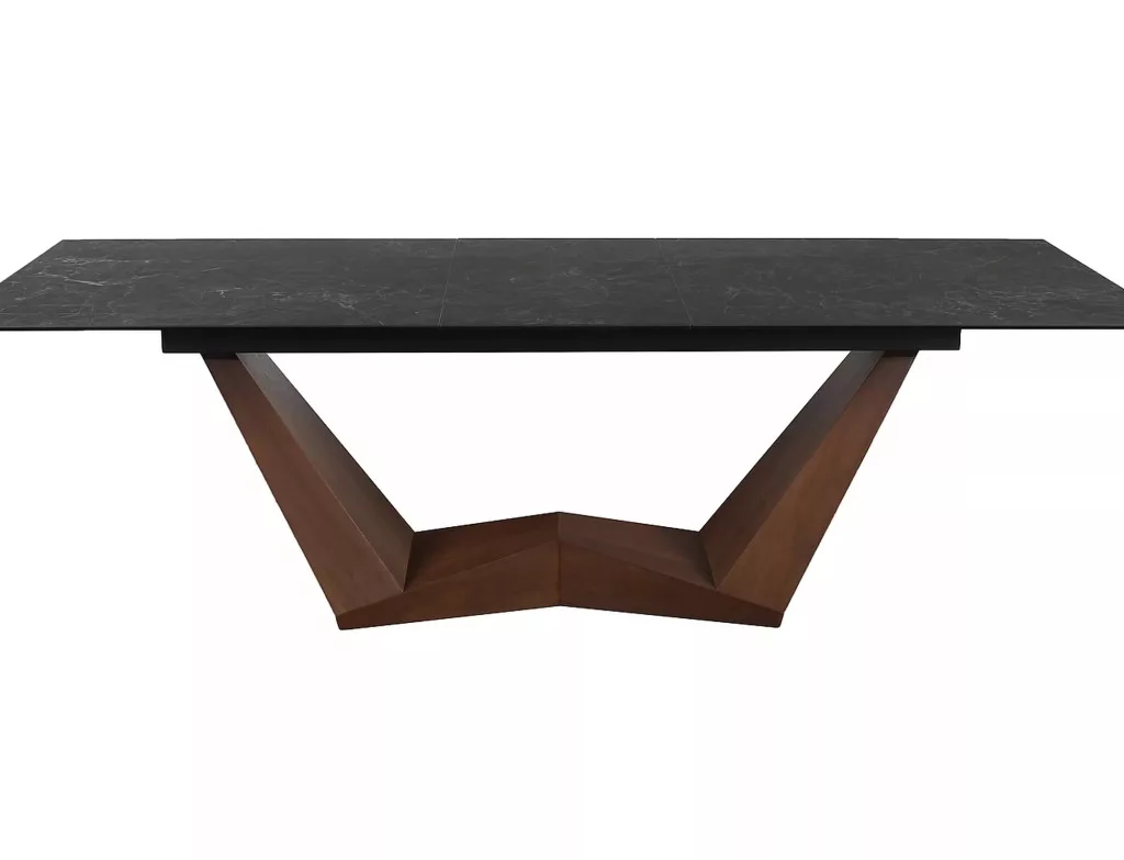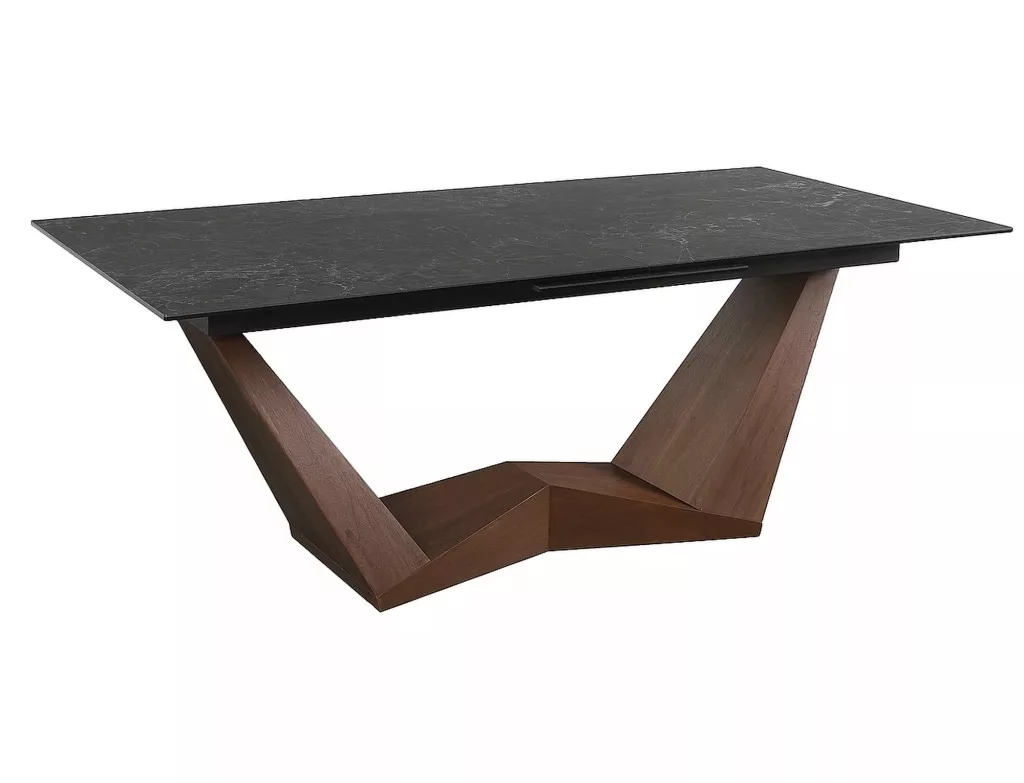 Meghosszabbítható asztal, asztallap: edzett üveg + olasz kerámia, NERO GRECO, váz: MDF + dió furnér, szín: fekete / dió.