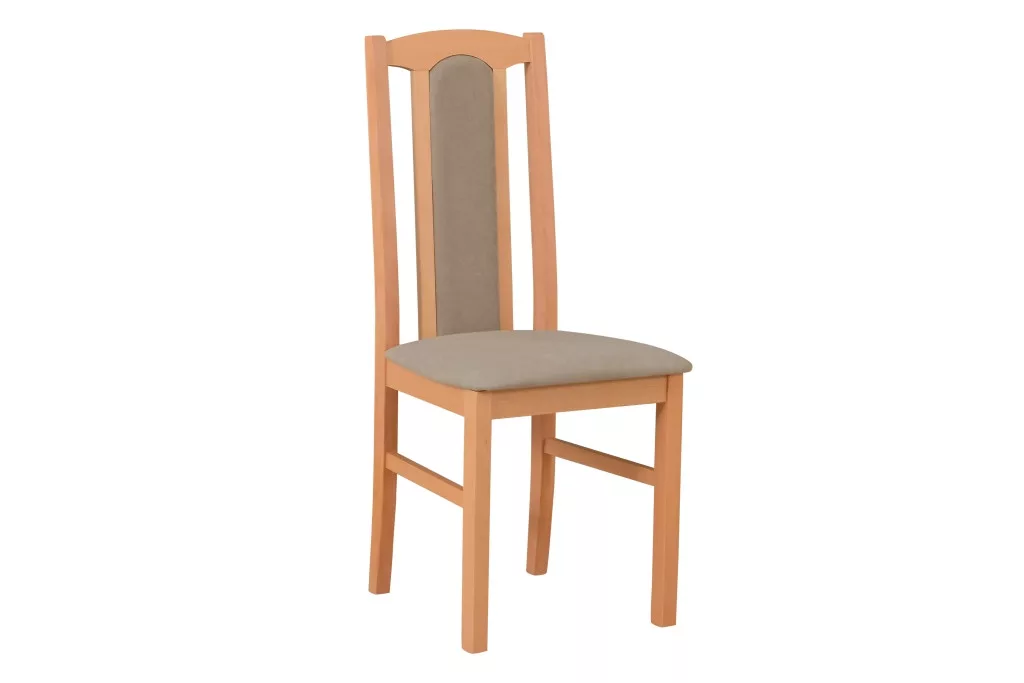 Elegáns, tömör bükkfából készült, kárpitozott étkezőszék, a klasszikus bútorokra emlékeztető vonalvezetéssel.