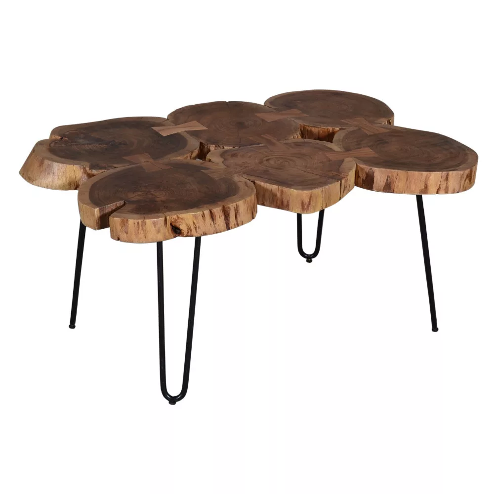 Széles dohányzóasztal, érdekes asztallappal, amely hat természetes hatású fa elemből és középen két lyukból áll. Az asztallap 50 mm vastag. Akácfából készült, és négy darab, 12 mm vastag, fekete színű vaslábon áll. Az asztal maximális teherbírása 25 kg.