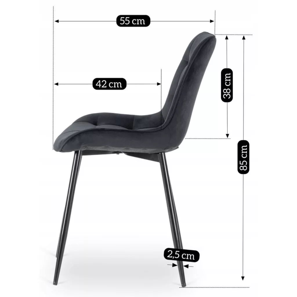 CHRIS Fekete Bársony Szék: Megbízható Társ a Mindennapi Pillanatokhoz. Olyan széket keresel, ami jól néz ki, kényelmes és évekig tart? A fekete Chris meglepően funkcionális és tökéletesen illik a mindennapi élethez – akár a reggeli kávéját élvezed, akár az asztalnál dolgozol, akár vendégeket hívsz vacsorára. A termék előnyei: Mindennapi Kényelem: A puha ülés és az enyhén kontúrozott háttámla kényelmet biztosít még hosszabb ülés során is. Stílusos Fekete Bársony: Az anyag elegánsnak tűnik, mégis nagyon praktikus. Könnyen tisztítható – egyszerűen töröld át egy nedves ruhával. Tartós konstrukció: A fekete porszórt fém lábak garantálják a stabilitást, és ellenállnak a káros külső tényezőknek, például a korróziónak és a lepattogzásnak. Stílusos Választás Bármilyen Beltérbe: A fekete Chris modell tökéletes választás számos belső térbe. Időtlen dizájnja kiegészíti a modern, loft és klasszikus belső tereket. Nagyszerű választás lesz konyhába, étkezőbe, nappaliba, valamint vendéglátóhelyekre – éttermekbe, bárokba és kávézókba.