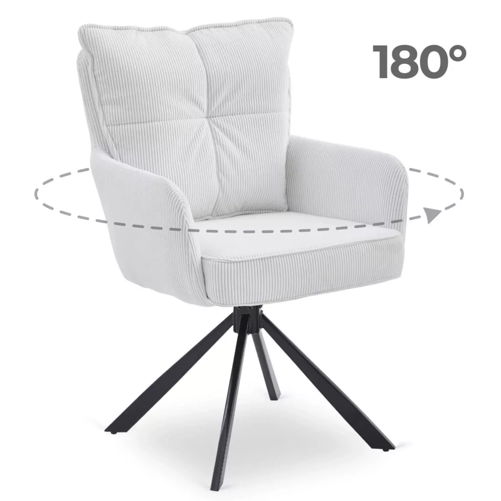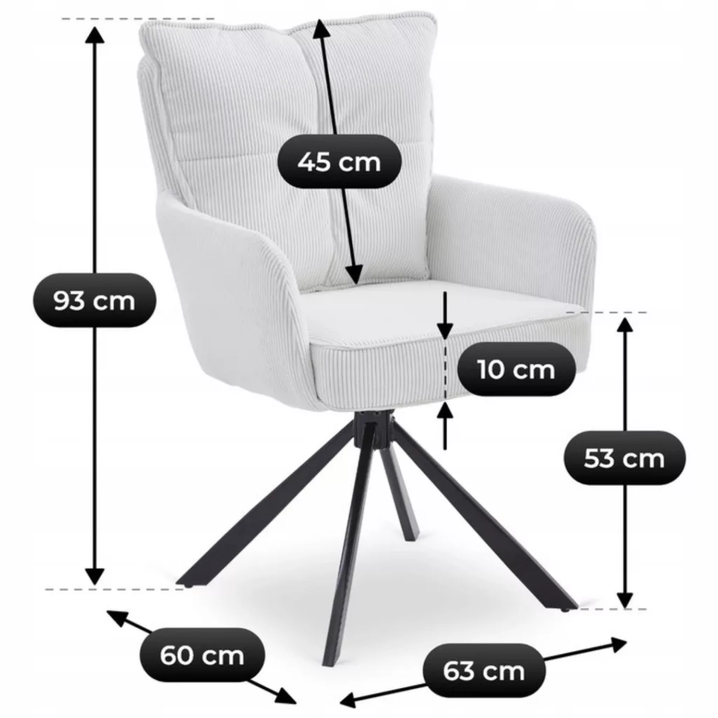 CITY Kárpitozott Forgószék - Krém. Olyan székre vágyik, ami egyszerre dekoratív és kényelmes? A City egy olyan modell, amely tökéletes a modern enteriőrökbe. Puha ülőfelületének és praktikus forgatási funkciójának köszönhetően kedvelt hellyé válik a közös étkezésekhez, beszélgetésekhez és a mindennapi pihenéshez. Különleges jellemzők: Stílusos dizájn - a háttámlán lévő varrás eleganciát kölcsönöz és kiemeli a bútor jellegét. Kárpitozott ülőfelület és háttámla - vastag, kényelmes párnázás garantálja a kényelmet még hosszabb ülés során is. 180°-os forgatási funkció - növeli a kényelmet a mindennapi használat során, és megkönnyíti az asztaltól való felállást. Masszív konstrukció - a feketére festett fém lábak stabilitást biztosítanak. Könnyű tisztítás - a krémszínű kordbársony anyag kellemes tapintású és ellenáll a mindennapi foltoknak. Hová helyezheti? Az étkezőben - ideális szék a családi asztalnál, tökéletes a közös étkezésekhez. A nappaliban - elegáns kiegészítője a pihenősaroknak. A konyhában - praktikus ülőhely egy konyhaszigeten vagy a reggelizőasztalon. Kereskedelmi helyiségekben - pl. irodában, váróteremben vagy tárgyalóban. Kinek ajánlott? A modern elegancia kedvelőinek. Családoknak, akik nagyra értékelik a kényelmet és a könnyű használhatóságot. Étterem- és irodatulajdonosoknak, akik a dizájnt és a funkcionalitást helyezik előtérbe. Válassza a Cityt – egy praktikus megoldást az Ön belső terébe.