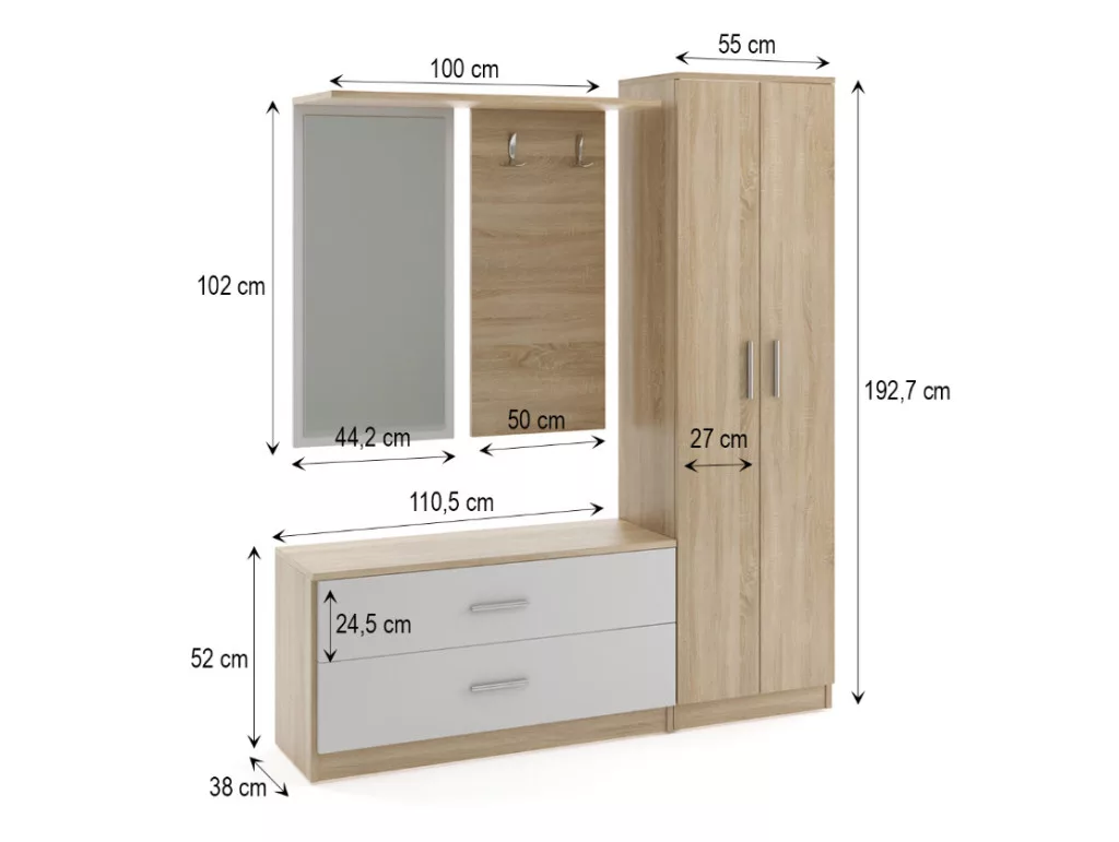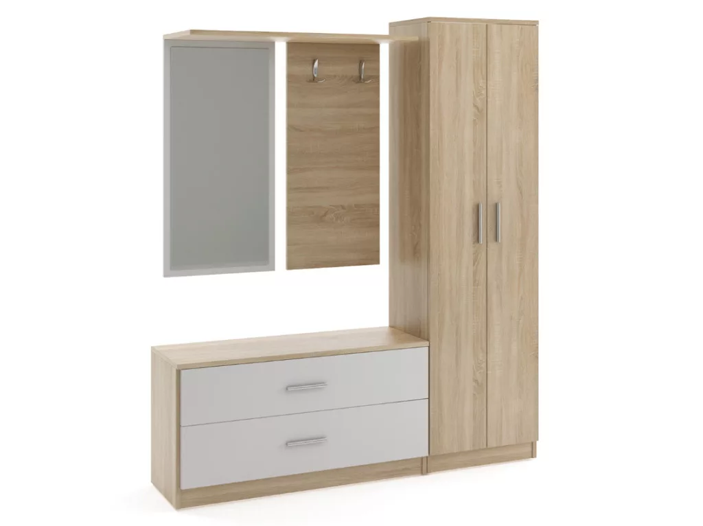 Dekoratív előszoba-garnitúra, polcos szekrénnyel, sok rakodóhellyel, egymástól függetlenül elhelyezhető elemekkel.