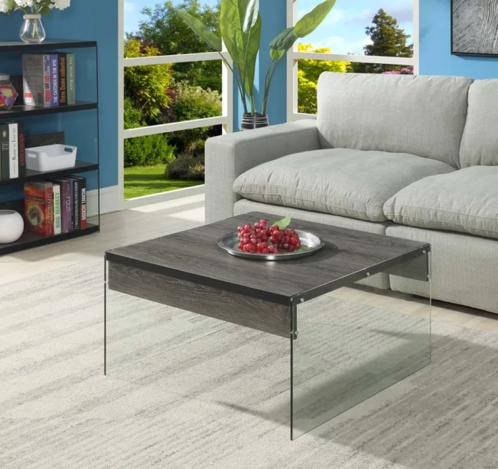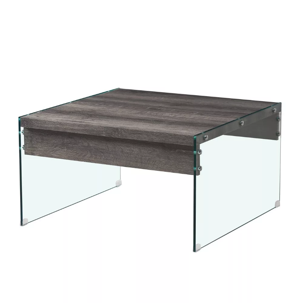 Alacsony profilú dohányzóasztal, szürke szín és üveg gyönyörű kombinációjában. Az asztallap 80x80 cm méretű, MDF anyagból, az oldalsó váz pedig 10 mm vastag üvegből készült. Az asztal maximális teherbírása 30 kg.
