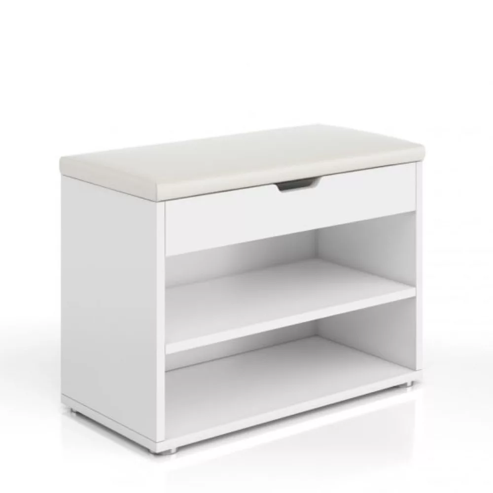 Praktikus cipőtartó, amely padként is használható. Fehér színű és MDF anyagból készült, kivéve a felső részt, amely fehér műbőrrel van kárpitozva. A felső részen egy doboz található, alatta pedig két polc, ahová cipőket vagy egyéb tárgyakat helyezhet.