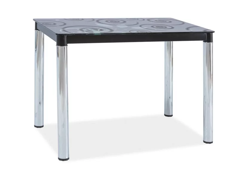 Étkezőasztal króm lábakkal, és mintás fekete edzett üveg asztallappal.