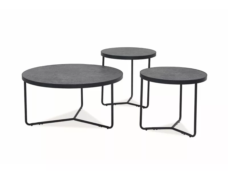 Dohányzóasztal szett fekete, fém lábakkal és beton hatású MDF + furnér asztallappal.