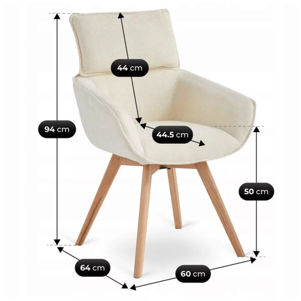 DIAS Krémszínű Bouclé kárpitozott forgószék. Olyan széket keres, amely kiemeli otthona karakterét, miközben maximális kényelmet biztosít? A divatos bouclé kárpitozású Dias modell stílusos választás a modern enteriőrökbe. Dőljön hátra, lazítson, és élvezze a kényelmet közös étkezések, megbeszélések vagy az asztalnál végzett munka során. Mi teszi különlegessé? A 360°-ban forgó ülés lehetővé teszi, hogy szabadon változtassa pozícióját anélkül, hogy a széket mozgatnia kellene. Kényelmes ülés - a masszív párnázás támogatja a helyes testtartást, és intenzív használat esetén is megőrzi formáját. A vödör forma és az ergonomikus háttámla garantálja a kényelmet még hosszú ülési időszakok során is.