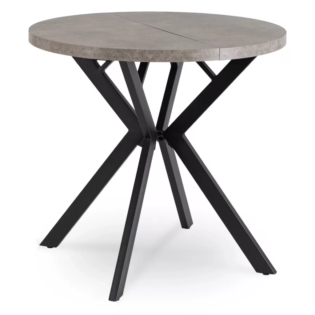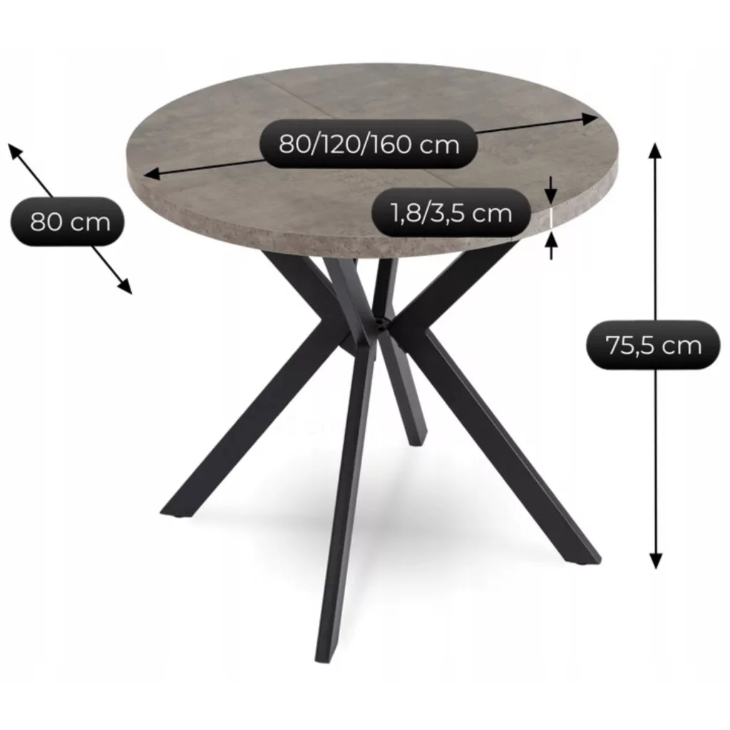 DORIAN Kerek Kihúzható Asztal Beton/Fekete színben. Egy stílusos belső térhez nem kell sok hely – mindössze egy jó ötletre és jól megválasztott bútorokra van szükséged. A Dorian kihúzható asztal beton színű, fekete lábakkal egy kompakt megoldás, amely lenyűgöző: egyszerű formájú, mégis megbízható, praktikus és kényelmesen használható. Miért válassza? Tartós, beton színű, forgácslapból készült asztallap – tartós, könnyen tisztítható és ellenáll a mindennapi használatnak; masszív élek – hosszabb élettartam és nagyobb biztonság érdekében; és acél, porszórt lábak – profilozott formával – stabilitást és modern vizuális könnyedséget garantálnak. Kihúzható funkció. A Dorian kompakt méretekkel rendelkezik a mindennapi használatra.