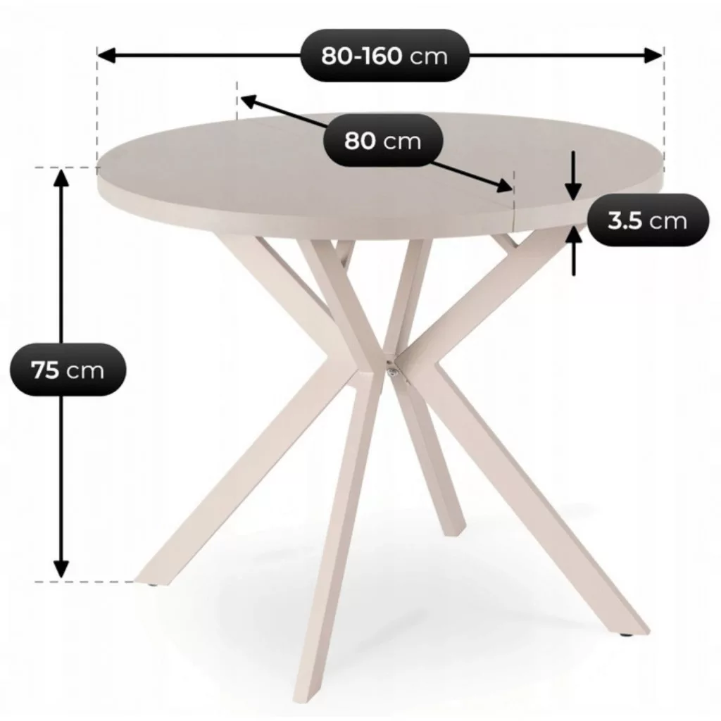 DORIAN Kasmír Kerek Kihúzható Asztal. Praktikus és elegáns bútort keres? A Dorian kasmír asztal a modern esztétika és a könnyű használat tökéletes ötvözete. A finom szín a lábak könnyed formájával kombinálva időtlen eleganciát teremt, amely tökéletes a különféle elrendezésekhez. Miért válassza ezt a modellt? A kasmír színű asztallap tartós forgácslapból készült - ellenáll a mindennapi használatnak és könnyen tisztítható; A fém alap - stabil, masszív és stílusos; Tartós konstrukció - a vastag asztallap és az erős csatlakozások sokéves használatot biztosítanak. Kihúzható - kényelmes mindennapi használatra és nagyobb alkalmakra. A standard asztalméret 80 x 80 cm, így tökéletes kisebb helyiségekbe. Ha több helyre van szüksége, két hosszabbítót használhat: egy hosszabbítóval: 120 cm - tökéletes családi vacsorákhoz; két hosszabbítóval: 160 cm - kényelmes hely megbeszélésekre és nagyobb ünnepségekre. Megjegyzés: a hosszabbítók külön tárolhatók. Hol fog a legjobban működni? Az étkezőben feltűnő fókuszpontként szolgál a közös étkezésekhez. A nappaliban elegáns és praktikus, további munkaterületként is szolgál. A konyhában naponta helyet takarít meg, és szükség esetén gyorsan átalakítható étkezőasztallá a vendégek számára. Válassza a Dorian asztalt, és élvezze a stílust minden nap.