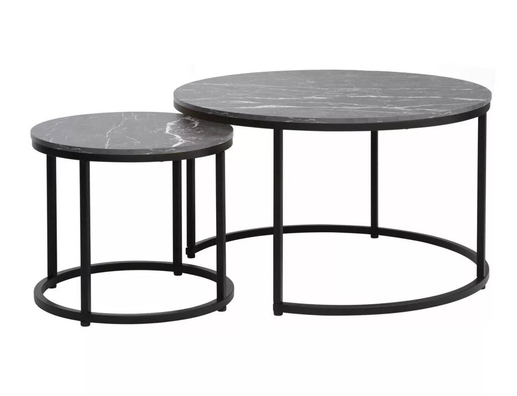 Kávézóasztal szett, asztallap: laminált forgácslap, váz: fém, szín: fekete, márványhatású / matt fekete. A kisebb asztal méretei: átmérő 48; magasság: 42 cm.