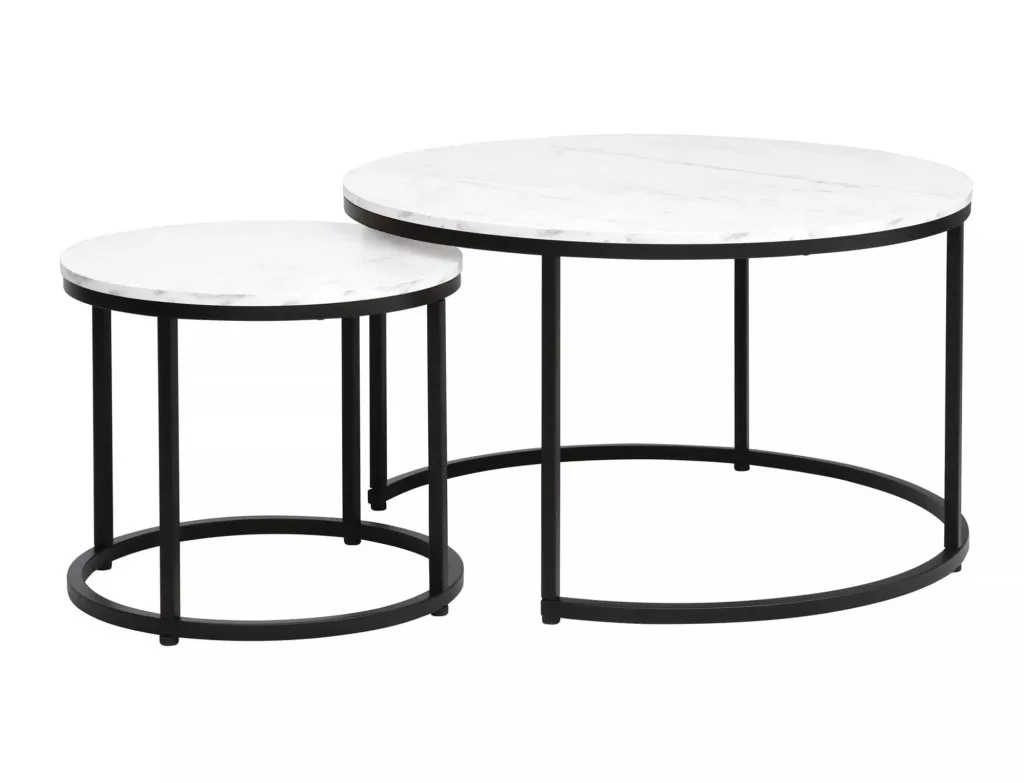Kávézóasztal szett, asztallap: laminált forgácslap, váz: fém, szín: fehér, márványhatású / matt fekete. A kisebb asztal méretei: átmérő: 48; magasság: 42 cm.