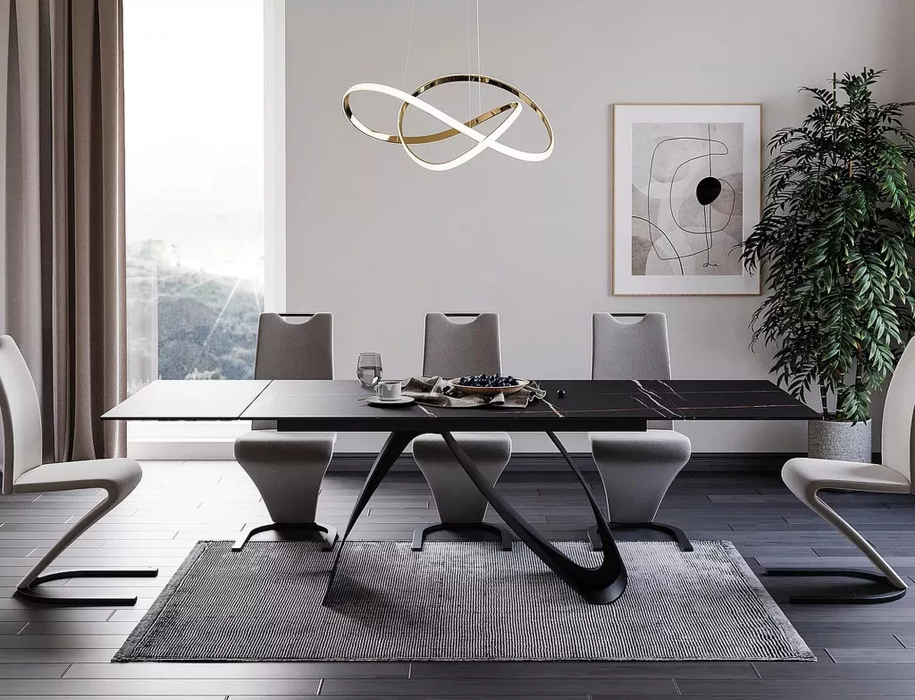 Meghosszabbítható asztal, teteje: edzett üveg + olasz kerámia - Sahara Noir, váz: fém, szín: matt fekete.