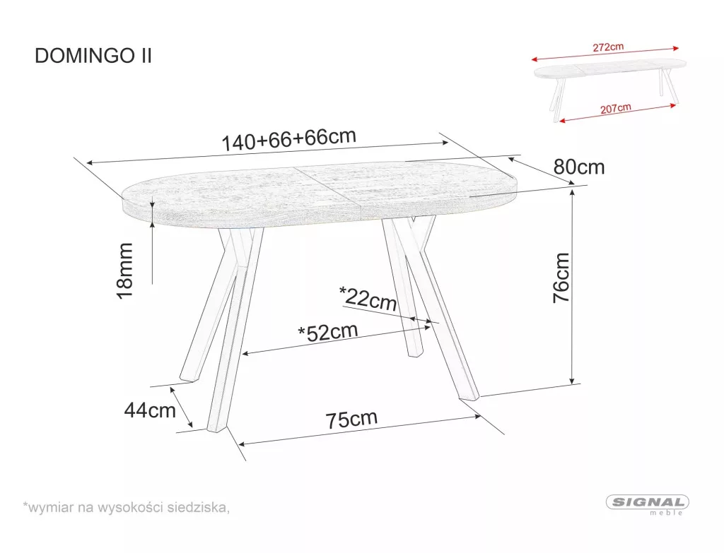 Meghosszabbítható asztal, teteje: natúr furnér, váz: fém, szín: tölgy/fekete. Asztal két további, egyenként 66 cm-es betéttel/tetejjel, az asztal hossza 140, 206 vagy 272 cm között állítható. Furnérvastagság 0,6 mm. Megjegyzés: a betéteket külön kell tárolni (nincs elkülönített hely a teteje alatt).