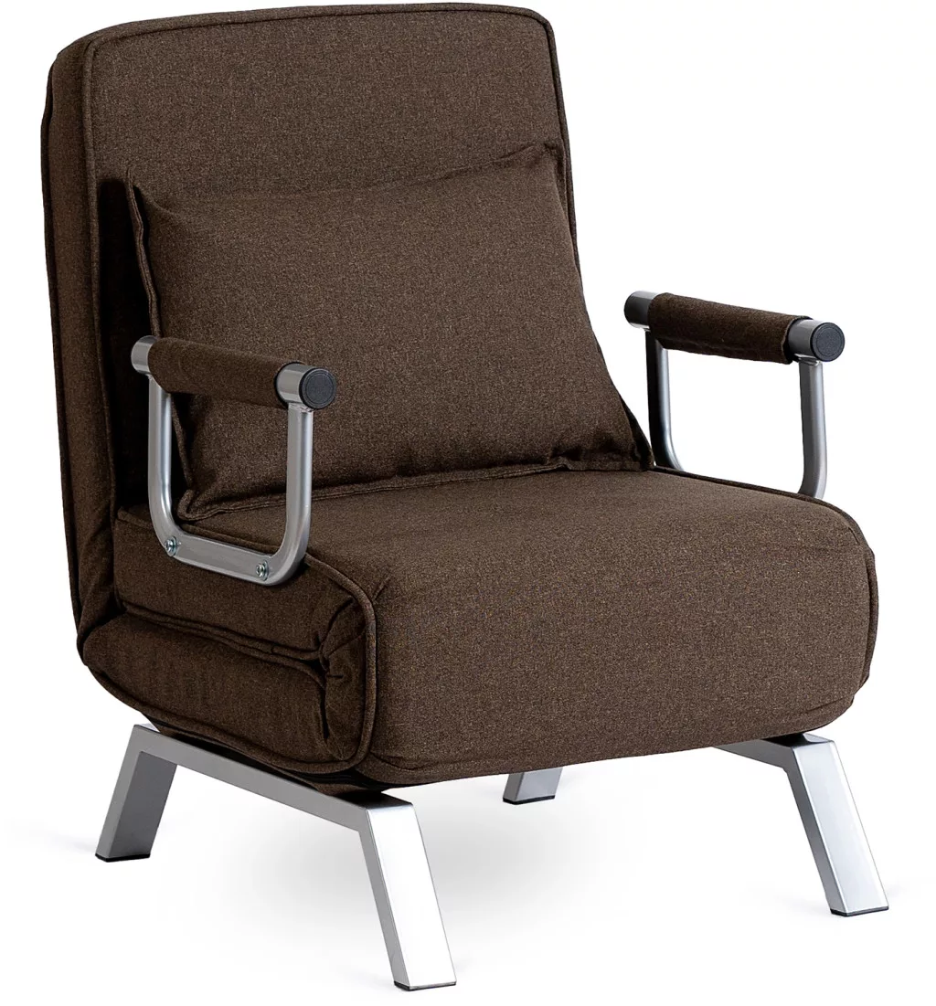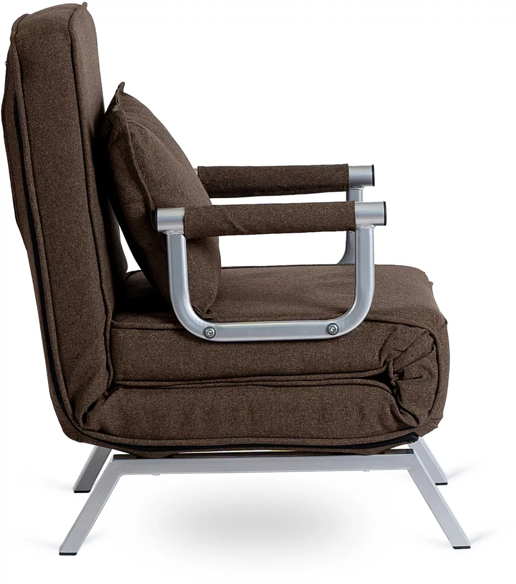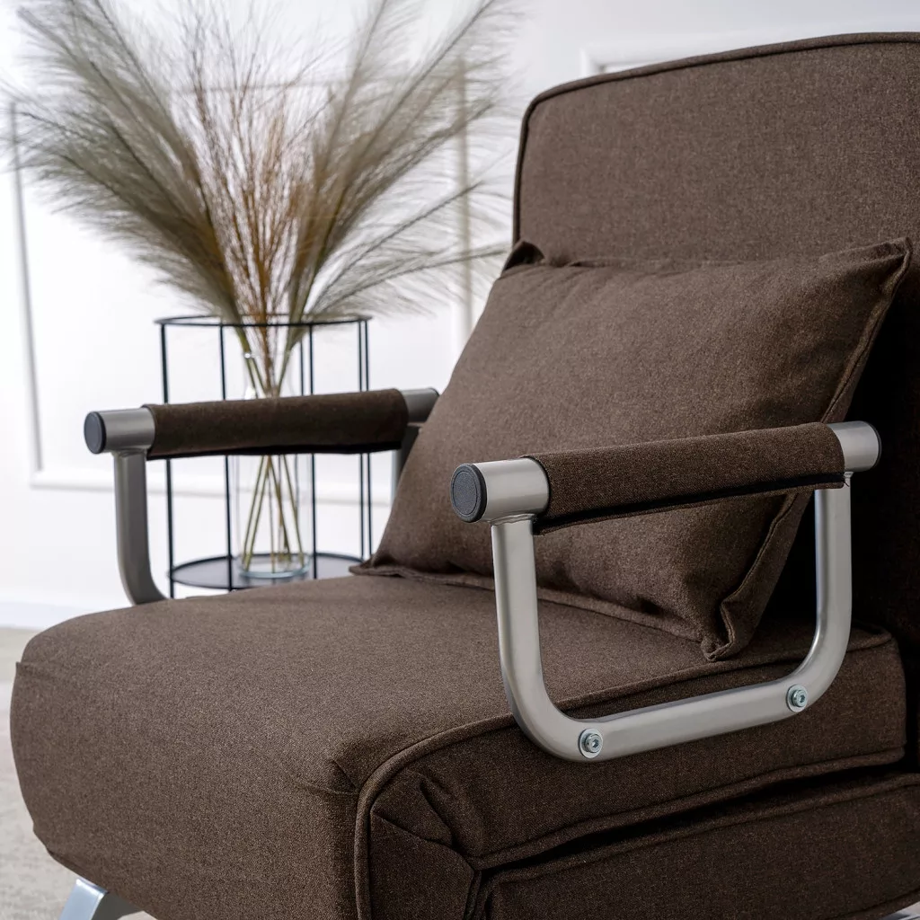 Modern dönthető fotel szövet kárpittal, barna színben. Karfás, ágyazható, 125 kg teherbírás, 63×72×83 cm.