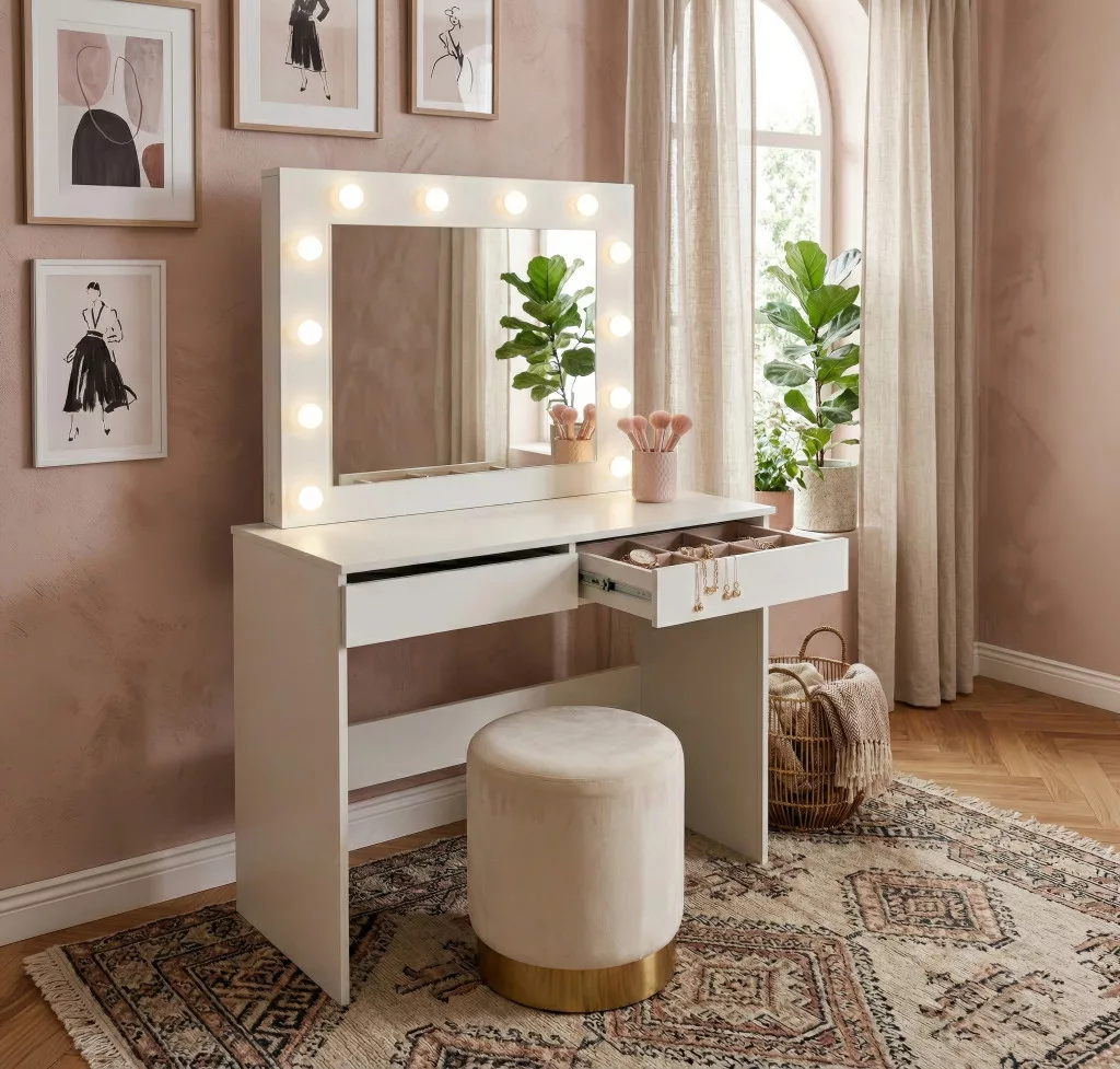 Kompakt sminkasztal kényelmes munkafelülettel, amelyen minden eszközét és kellékét elhelyezheti.