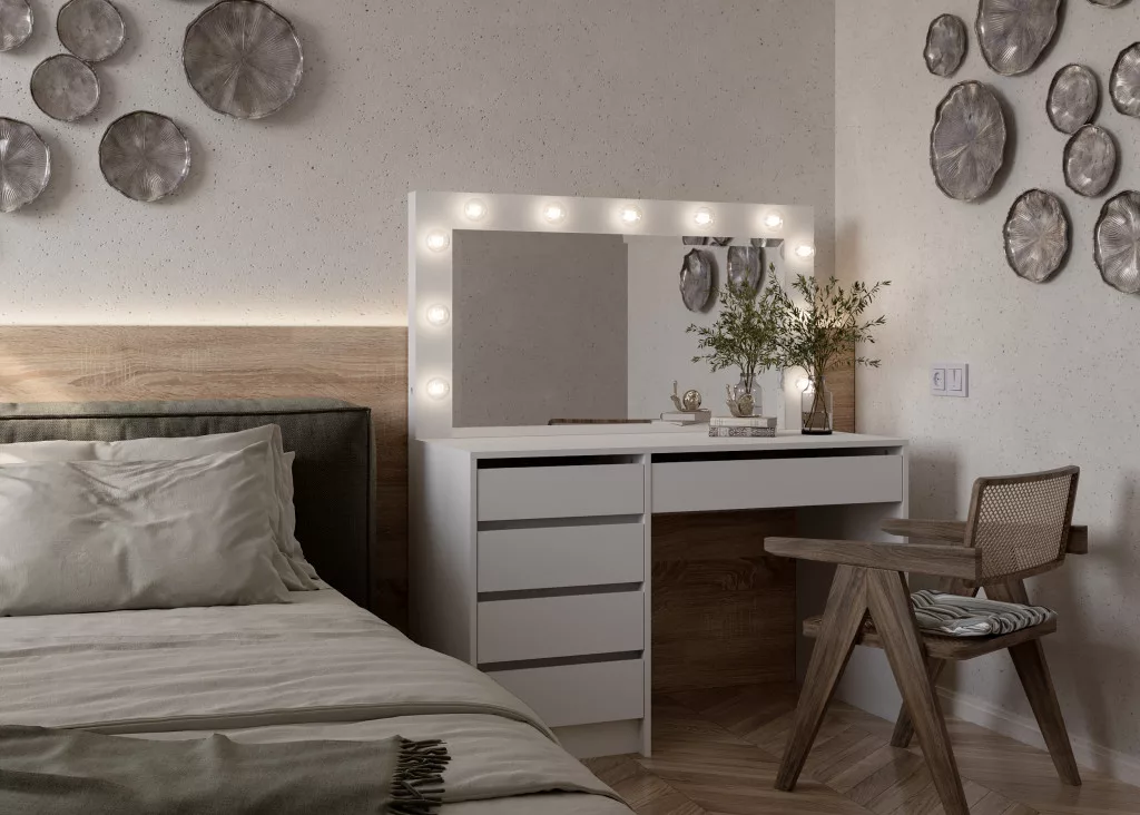 Kompakt sminkasztal kényelmes munkafelülettel, amelyen minden eszközét és kellékét elhelyezheti.