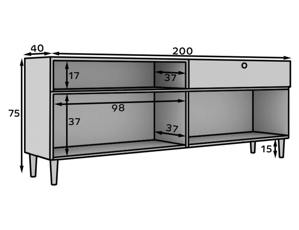 A Dullum tálalószekrény egy elegáns és praktikus bútor, méretei: 40 cm mély, 200 cm széles és 75 cm magas. A tábla vastagsága 16 mm, ami szilárd és tartós szerkezetet biztosít. Golyóscsapágyas vezetővel rendelkezik, amely lehetővé teszi a fiók egyenletes és megbízható működését. Az egyes szekrények teherbírása 3 kg, így alkalmas különféle tárgyak tárolására a stabilitás és a funkcionalitás megőrzése mellett.