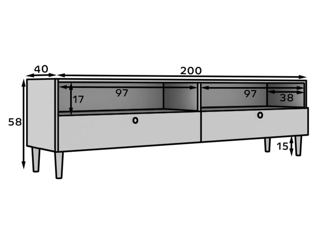 A Dullum TV-állvány egy elegáns és funkcionális bútordarab, melynek méretei 40 cm mélyek, 200 cm szélesek és 58 cm magasak. Két nyitott polccal és két fiókkal rendelkezik, amelyek kényelmes tárolóhelyet biztosítanak a TV-készülékek és más alapvető tárgyak számára. Modern kialakításának és praktikus elrendezésének köszönhetően tökéletesen illeszkedik a különböző belső stílusokhoz, stílust és eleganciát adva bármely helyiségnek.